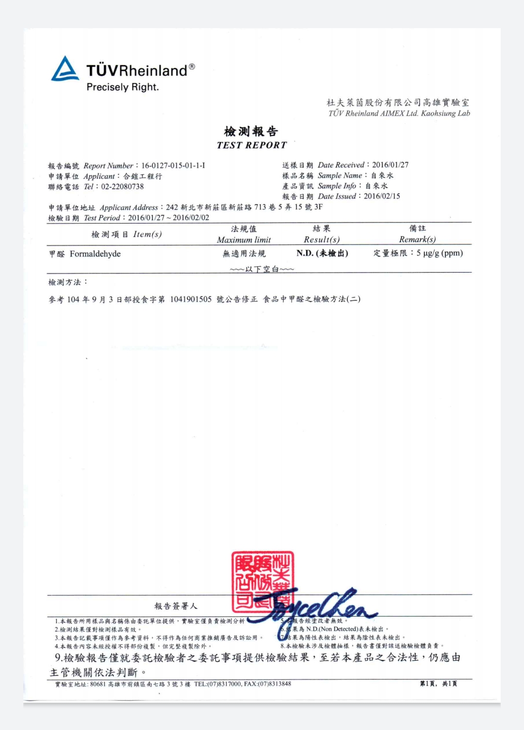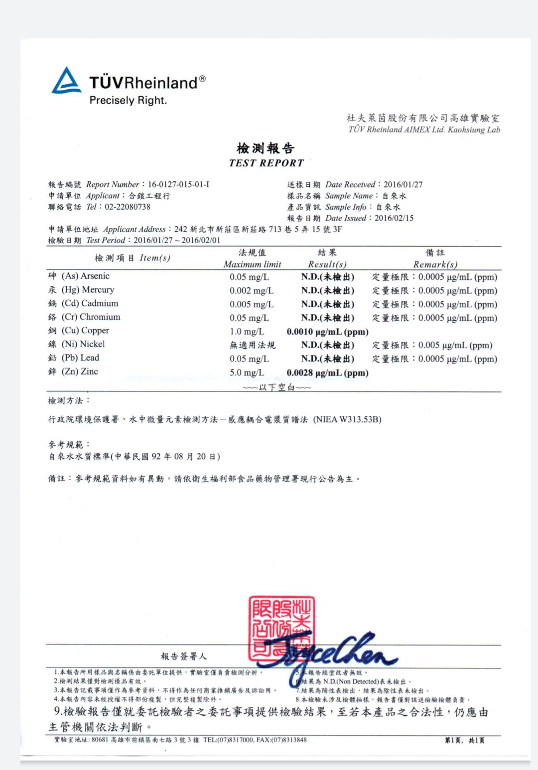圖片為 杜夫萊茵 水質檢測報告書 -